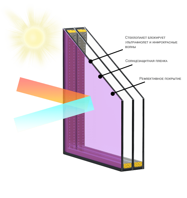 - Низкоэмиссионное напыление на стеклах обеспечивает высокую теплоизоляцию, поэтому остекление может быть теплым. Покрытие препятствует поступлению морозного воздуха из внешней среды. А со стороны помещения отражает тепловые волны в комнату, не выпуская их наружу.