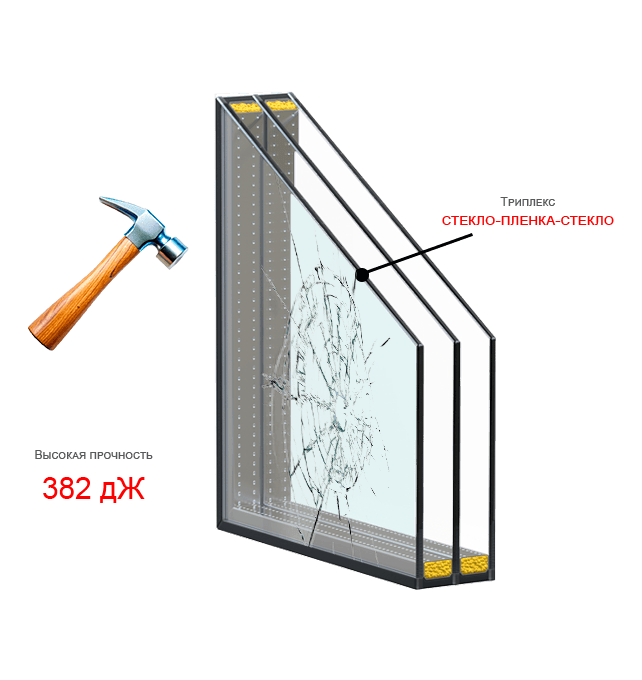 Это светопрозрачное заполнение повышенной прочности. Целесообразно выбирать его для новостроек, в которых проживают активные дети. Стеклопакет включает закаленное стекло или триплекс – систему из нескольких слоев стекол, соединенных полимером. Безопасность сохраняется даже при повреждении стекла. Закаленное рассыплется на тупые большие осколки. У триплекса части останутся на пленке, не разлетятся.