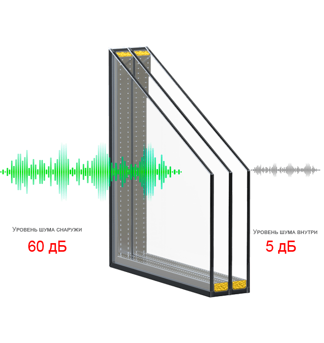 Чтобы избежать проникновения в помещение внешних шумов, выбирайте шумоизоляционный стеклопакет. Его наружное стекло более толстое – 6 мм взамен 4 мм. Чтобы создавать акустический эффект, используются разные по ширине дистанционные рамки. Также в состав стеклопакета может входить триплекс, состоящий из нескольких стекол, соединенных полимерной пленкой или клеем.